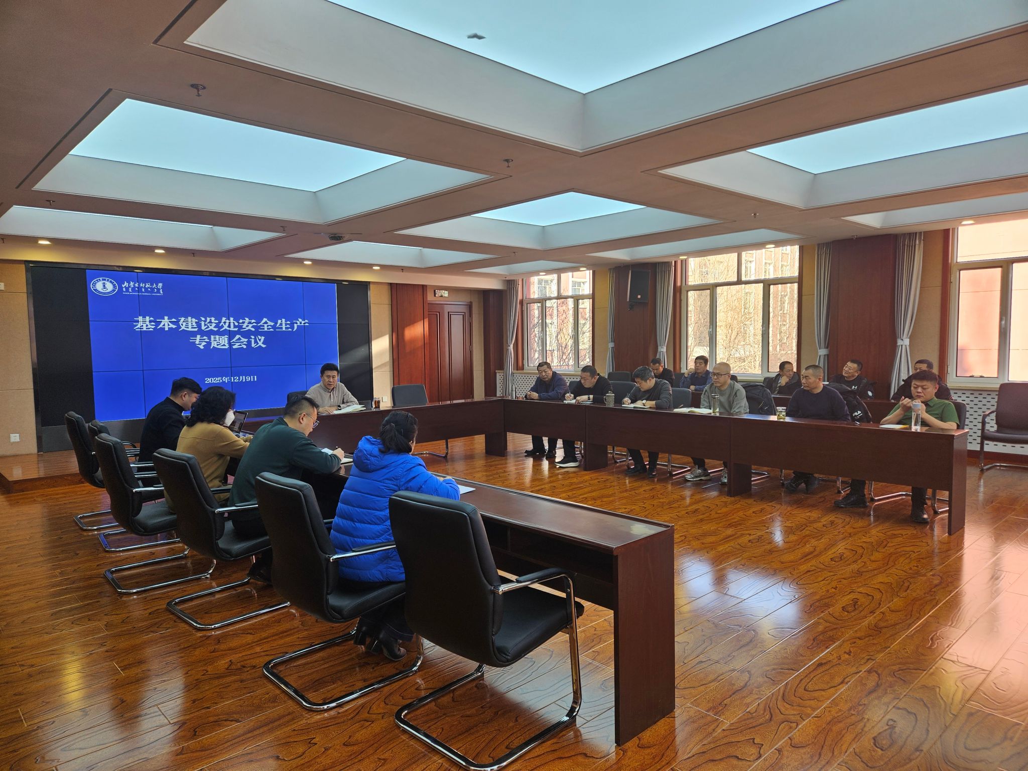 12月9日上午,基本建设处在盛乐校区召开安全生产专题会议,会议由石连柱处长主持,基建处全体人员及第三方公司负责人参加。